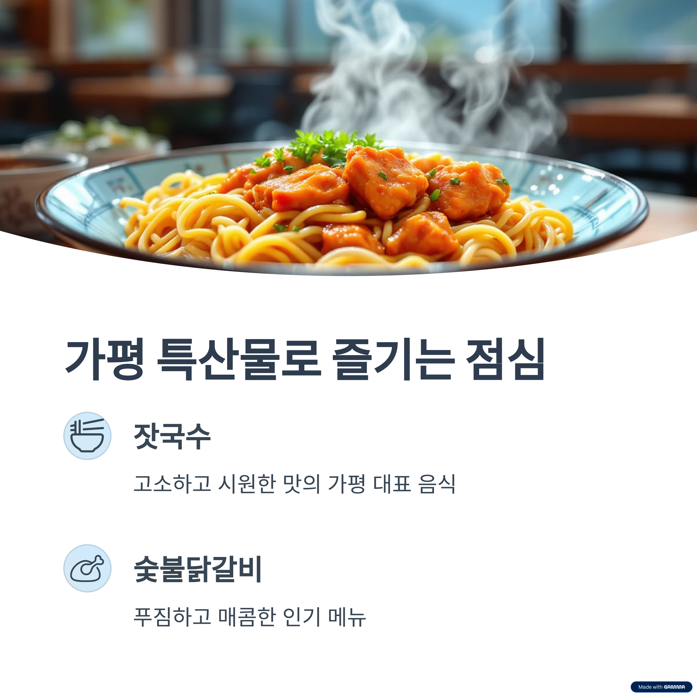 A: 가평은 잣국수와 숯불닭갈비로 유명합니다.