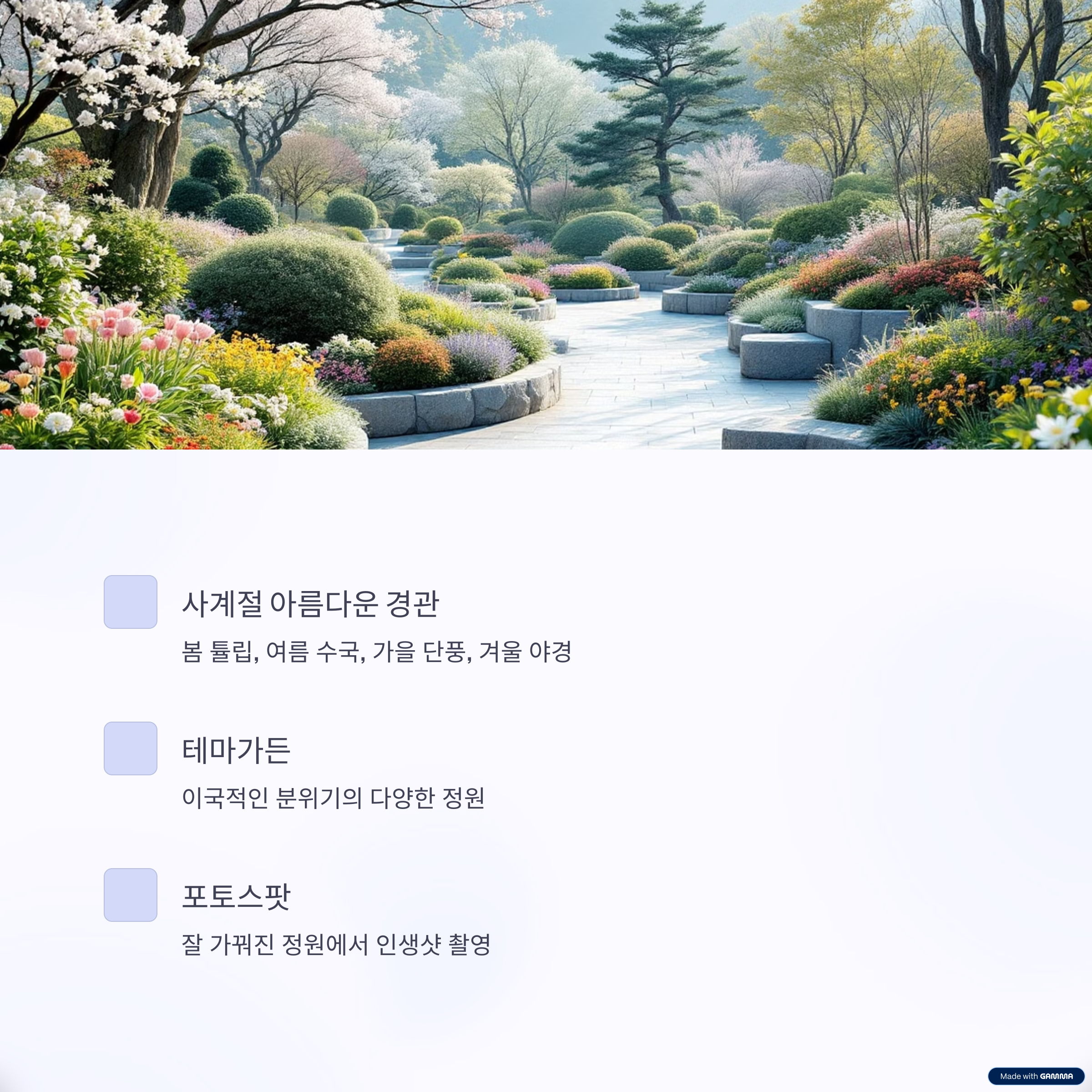 봄에는 튤립과 수선화, 여름엔 초록 숲과 수국, 가을엔 단풍, 겨울엔 야경과 조명이 매력적입니다.