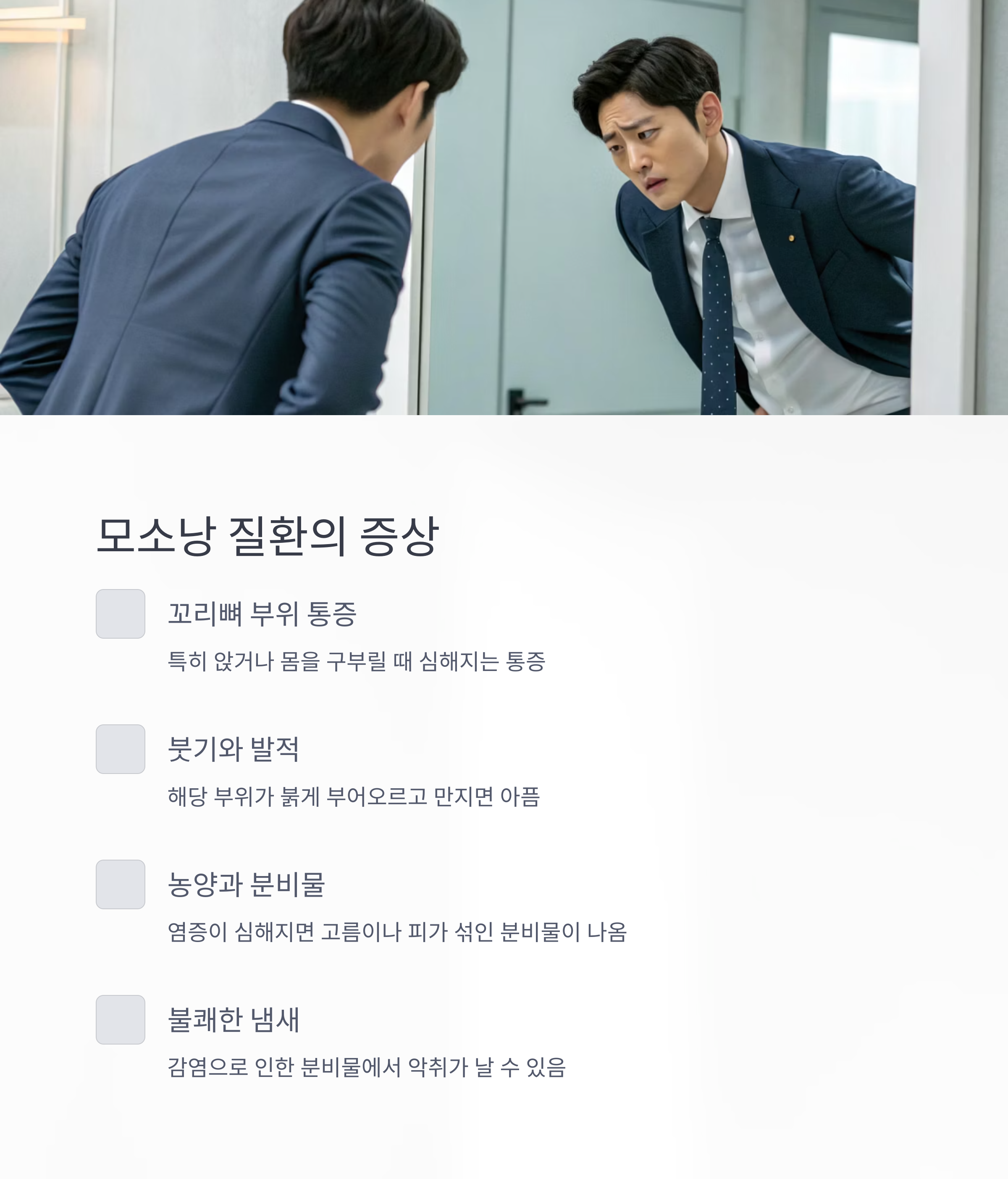 모소낭 질환은 방치할 경우 만성화되기 쉬운 만큼, 조기에 증상을 파악하는 것이 중요해요.
