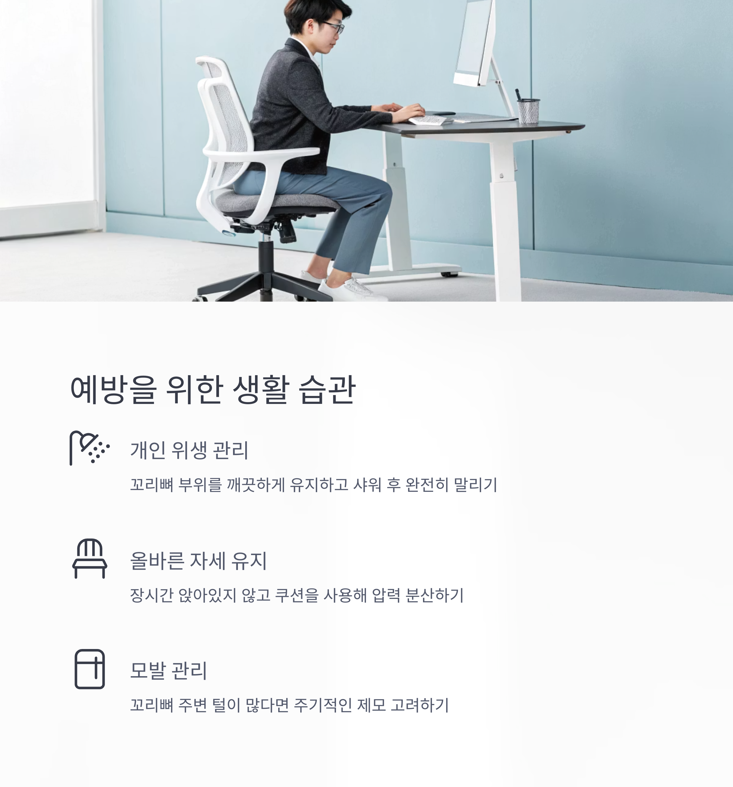 평소 청결과 자세에 신경 쓰는 것, 너무 오래 앉아 있지 않는 것,