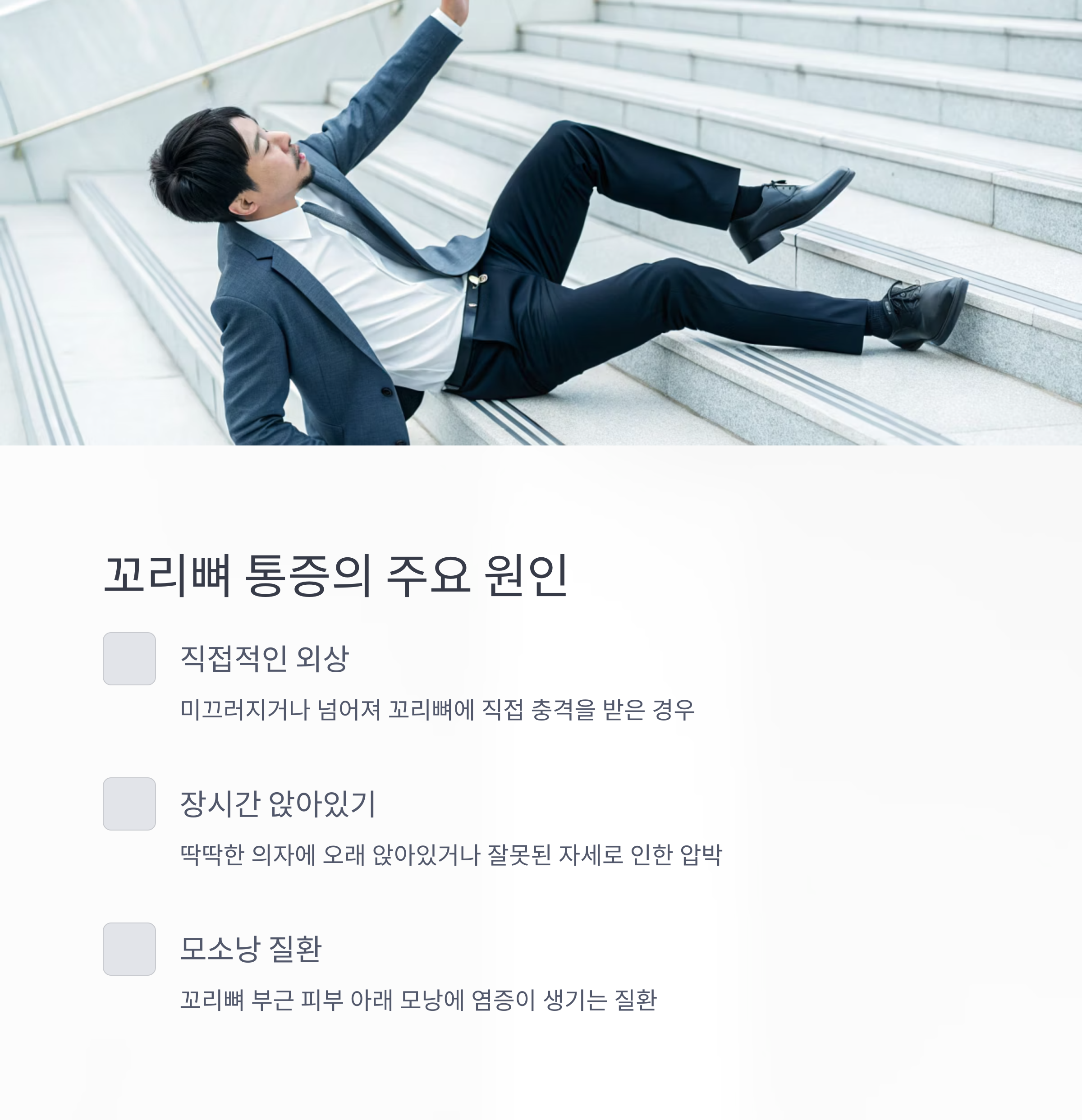 교통사고나 낙상 등 외부 충격에 의한 골절, 앉는 자세가 틀어진 경우, 또는 하부 척추의 퇴행성 변화 등이 대표적이에요.