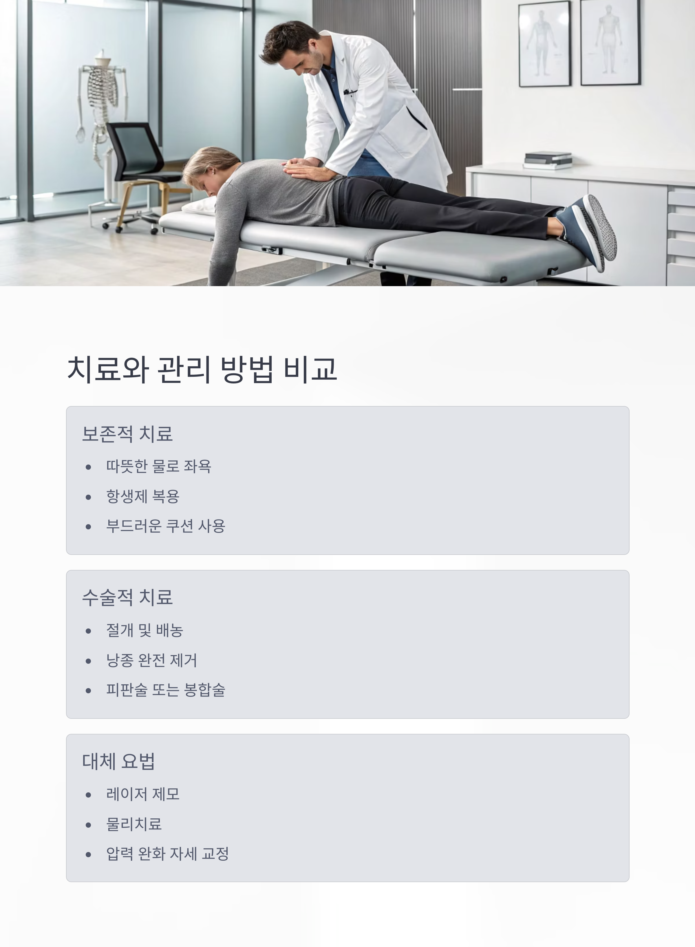 보존 치료 약물, 소독, 좌욕 등으로 증상 완화. 경미한 경우에 적합