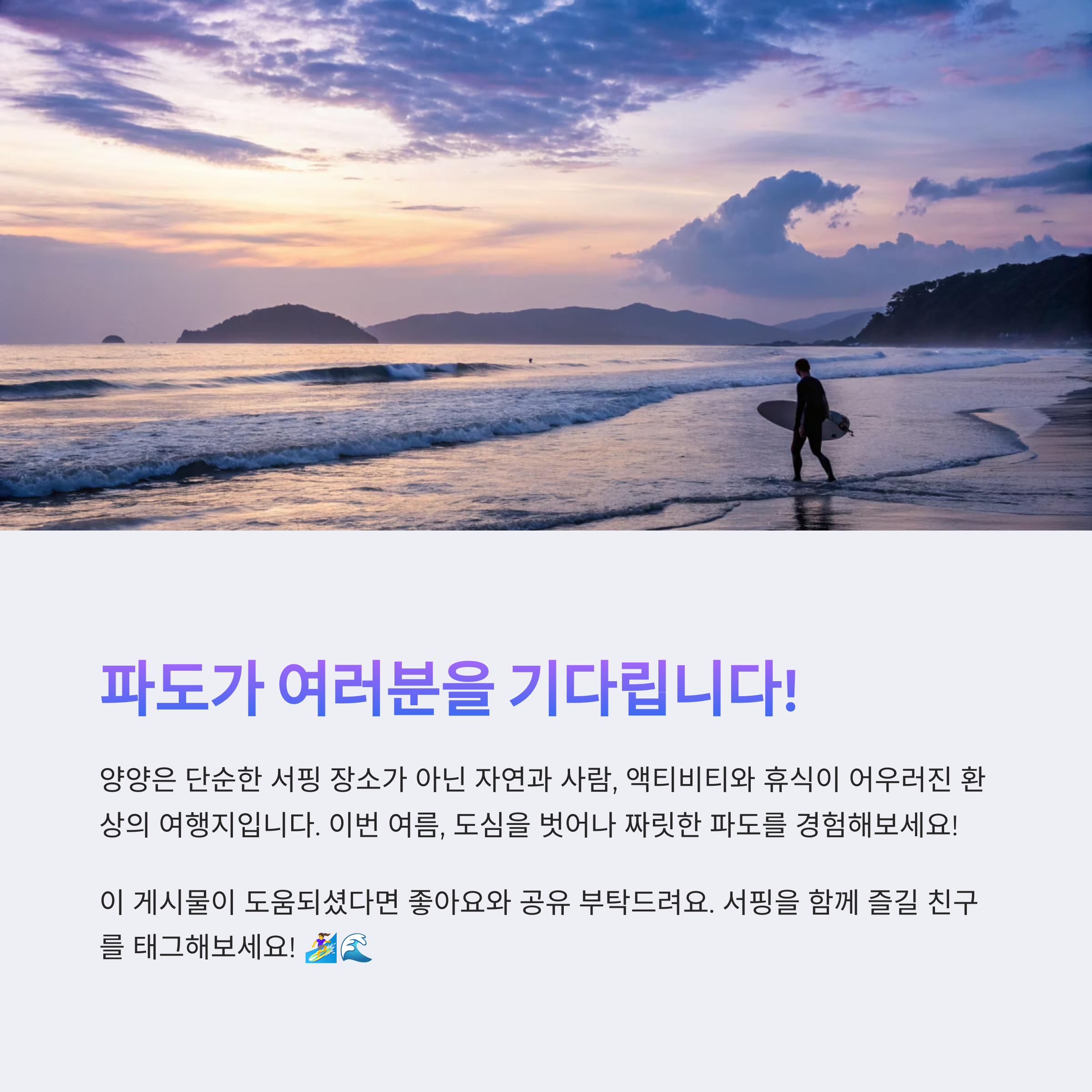 이번 여름, 시원한 바다와 함께 특별한 추억을 만들고 싶다면 양양 서핑 여행이 제격이에요. 초보자도 안심하고 즐길 수 있는 안전한 강습 환경, 죽도·인구·낙산 등 각기 다른 매력을 지닌 해변들, 맛있는 현지 음식과 카페까지! 여름휴가 여행지로 양양만큼 준비된 곳도 드물답니다. 특히 7월과 8월처럼 더운 시기엔 도심을 벗어나 시원한 파도를 타는 경험이 정말 힐링이에요. 여름 여행, 어디 갈지 고민된다면 이번엔 파도 위로 떠나보세요!