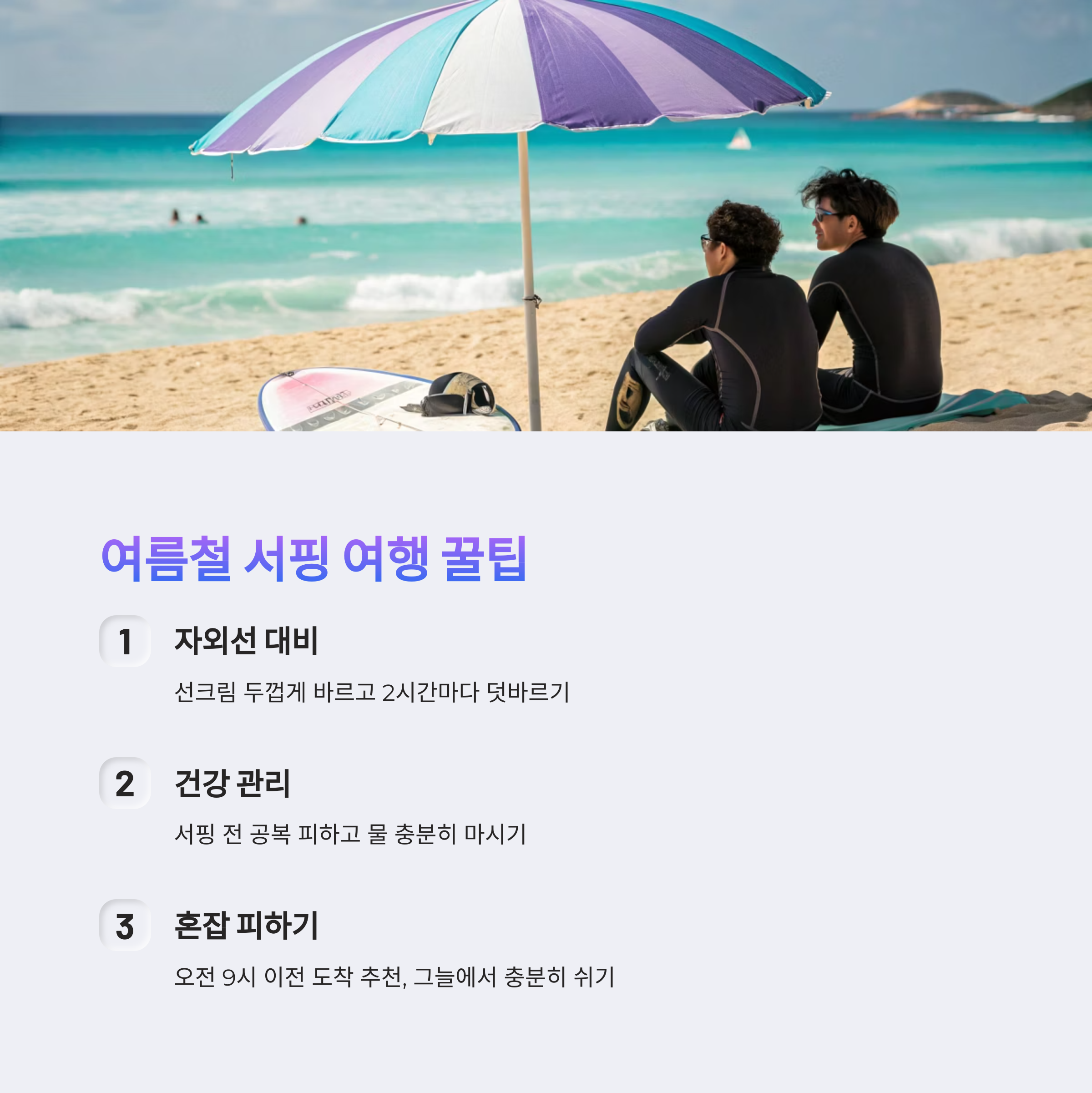 무엇보다 여름철은 폭염주의보가 자주 발생하니, 체온 조절을 잘 하고 그늘에서 충분히 쉬어주는 것도 중요해요. 준비만 잘하면 누구나 안전하고 즐거운 서핑 여행을 만들 수 있어요!