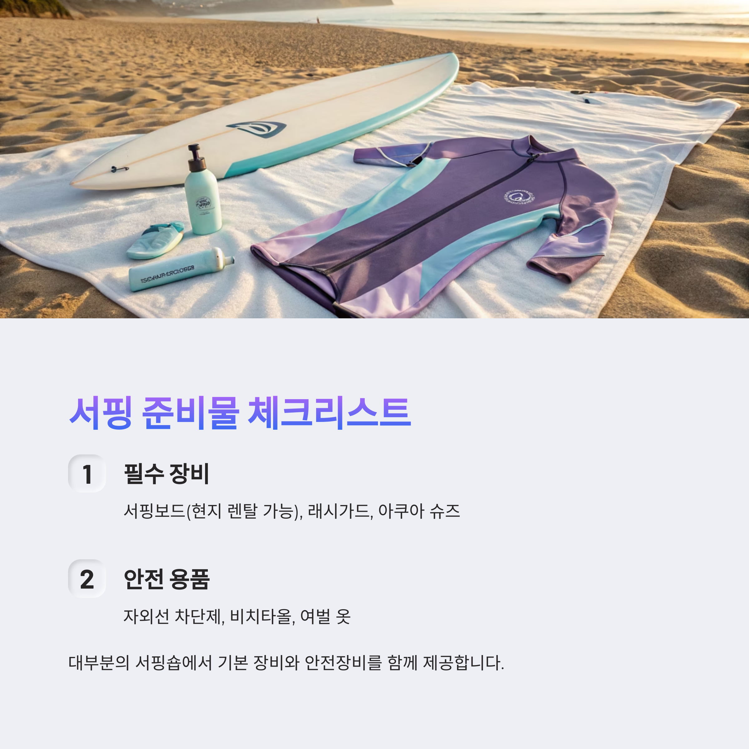 보드는 현지에서 대여가 가능하고, 대부분의 서핑숍에서는 기본 장비는 물론 안전장비까지 함께 제공해요. 래시가드는 햇볕으로부터 피부를 보호해 주고, 보드와의 마찰을 줄여주는 역할을 해요. 특히 여름에는 강한 자외선 때문에 선크림은 필수랍니다!