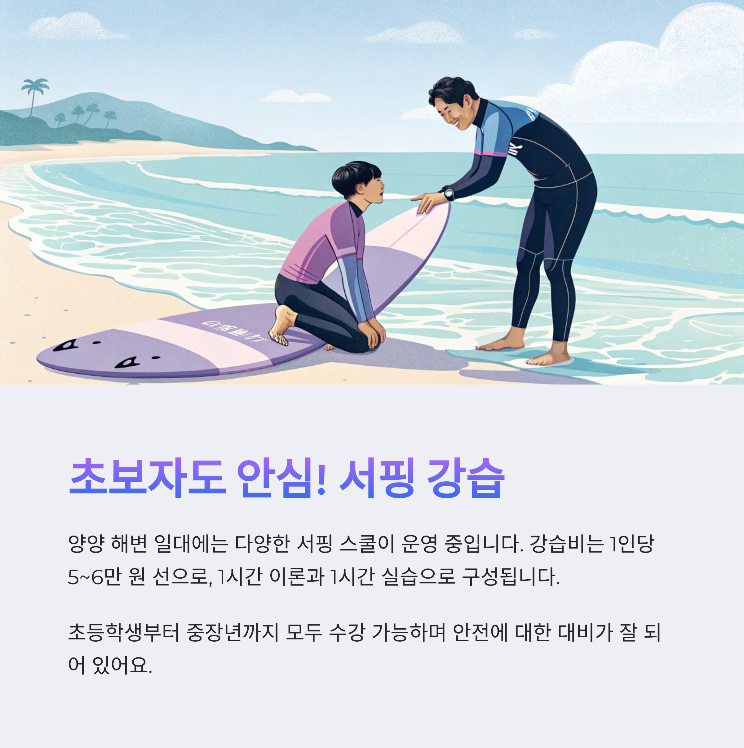 양양 해변 일대에는 다양한 서핑 스쿨이 운영되고 있어요. 대부분 초보자 대상 강습이 잘 갖춰져 있고, 강습비는 보통 1인당 5~6만 원 선이에요. 강습 시간은 1시간 이론, 1시간 실습으로 구성되며, 인원수가 많아질수록 할인도 가능하죠.