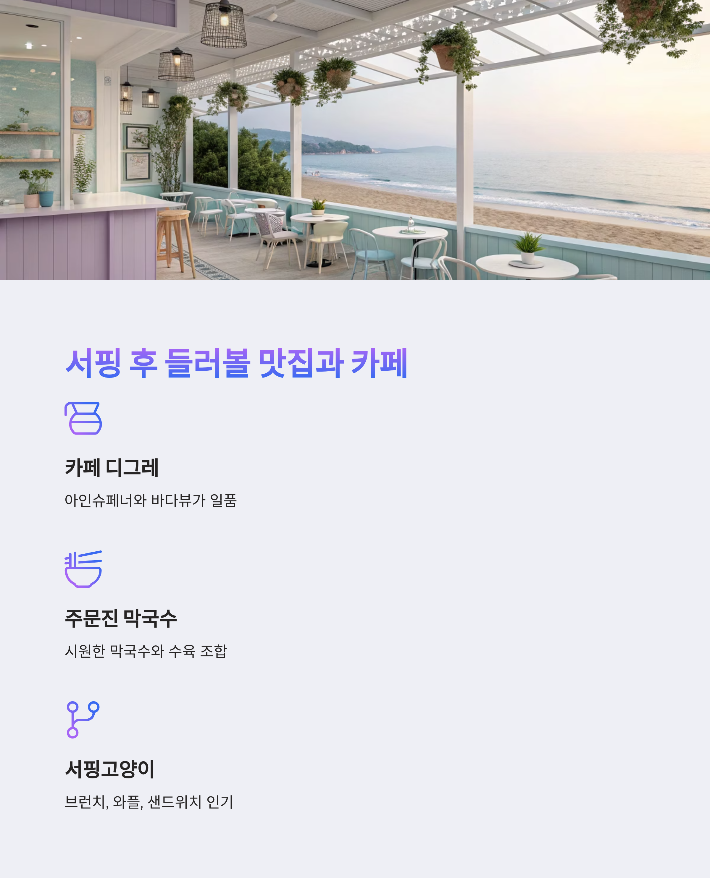 바다에서 시간을 보내고 나면 허기진 배를 채워줄 맛집 탐방이 빠질 수 없겠죠? 개인적으로는 디그레의 아인슈페너와 해지는 바다를 함께 바라보는 순간이 정말 최고였어요. 근처 막국수집도 가성비와 맛 모두 만족스러워 꼭 추천하고 싶어요.