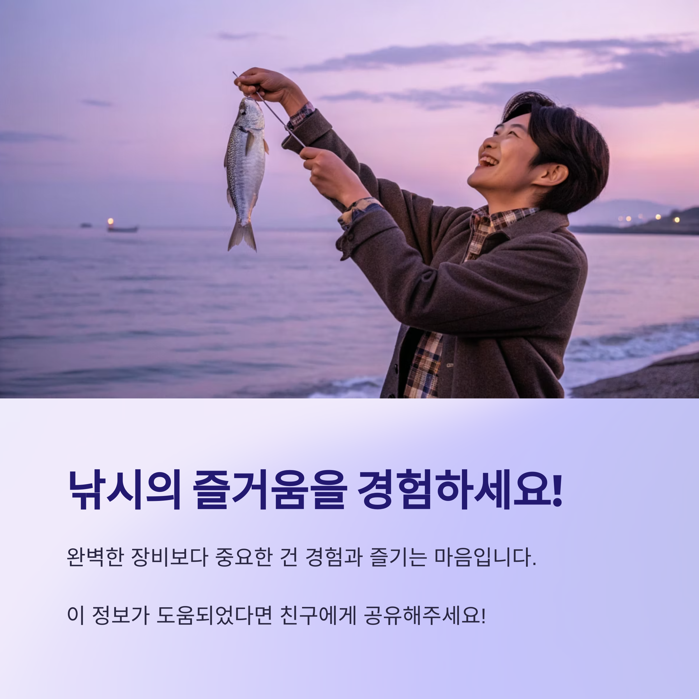 오늘 소개한 기본 장비와 예산별 추천 세트만으로도 생활낚시는 충분히 시작할 수 있고, 즐길 거리도 무궁무진합니다.