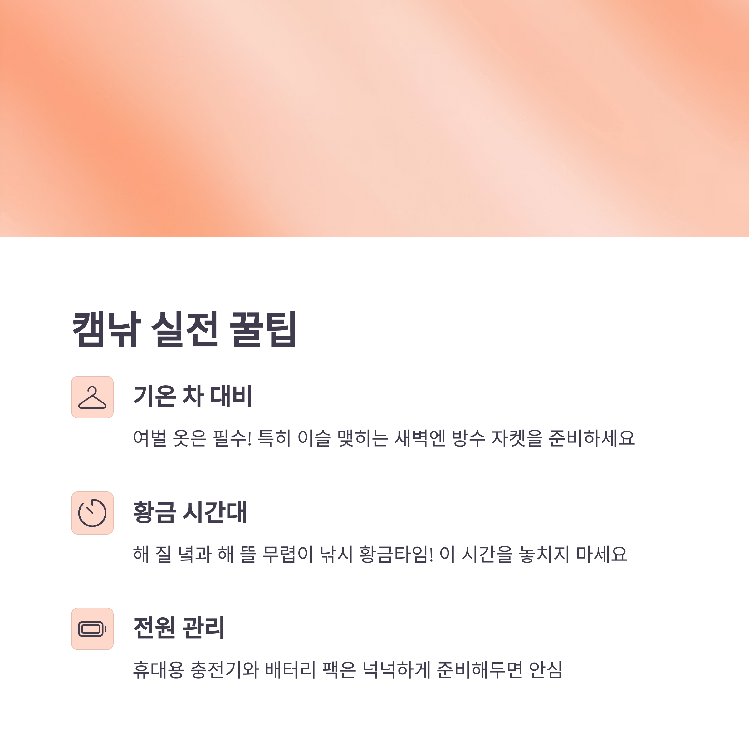 이 팁들만 잘 기억해도 첫 캠낚 여행이 한결 더 즐거워질 거예요. 작은 준비가 큰 만족으로 돌아오는 법이죠!