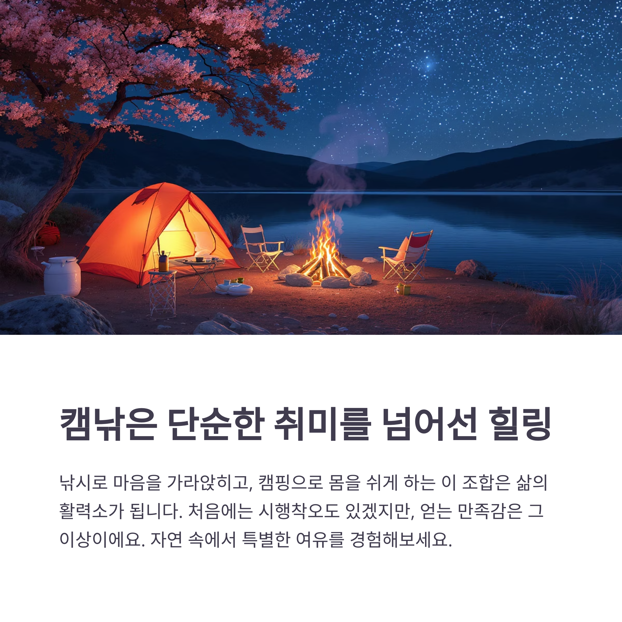 요즘 같은 시대, 잠시라도 도시를 떠나 자연과 마주하는 시간이 얼마나 소중한지 새삼 느껴요. 낚시로 마음을 가라앉히고, 캠핑으로 몸을 쉬게 해주는 이 조합은 단순한 취미를 넘어서 삶의 활력소가 되어줍니다. 물론 처음에는 준비물도 많고 시행착오도 있을 수 있지만, 그만큼 얻는 만족감은 이루 말할 수 없죠. 저도 첫 캠낚 여행에서 낚은 손맛에 흠뻑 빠져버렸거든요. 이 글이 여러분의 새로운 도전의 발판이 되었길 바라며, 자연 속에서의 여유로움과 따뜻한 감성이 가득한 시간이 되시길 응원합니다!