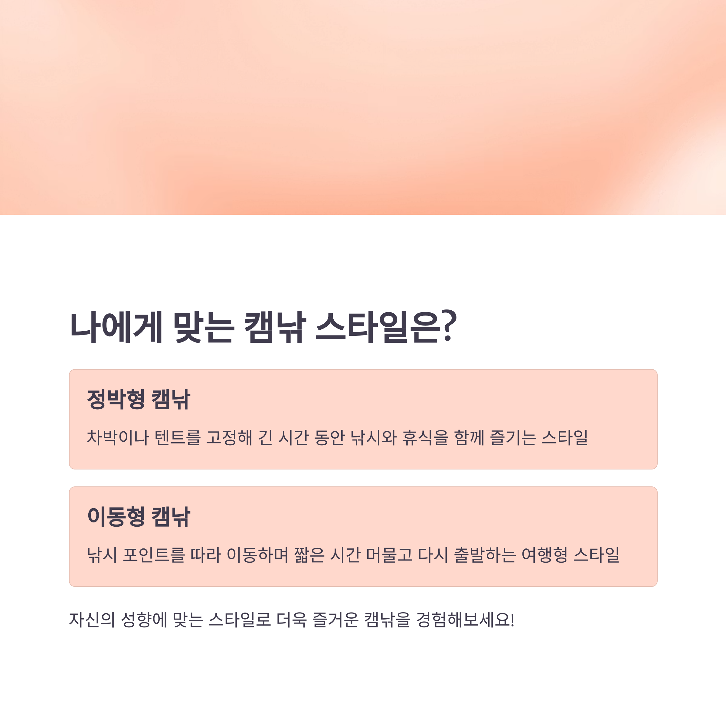 정박형은 ‘한 자리를 잡고 푹 쉬자’는 스타일이라면, 이동형은 ‘낚시도 여행도 욕심내보자’는 분들께 딱이에요. 각자의 성향에 맞게 즐겨보세요!