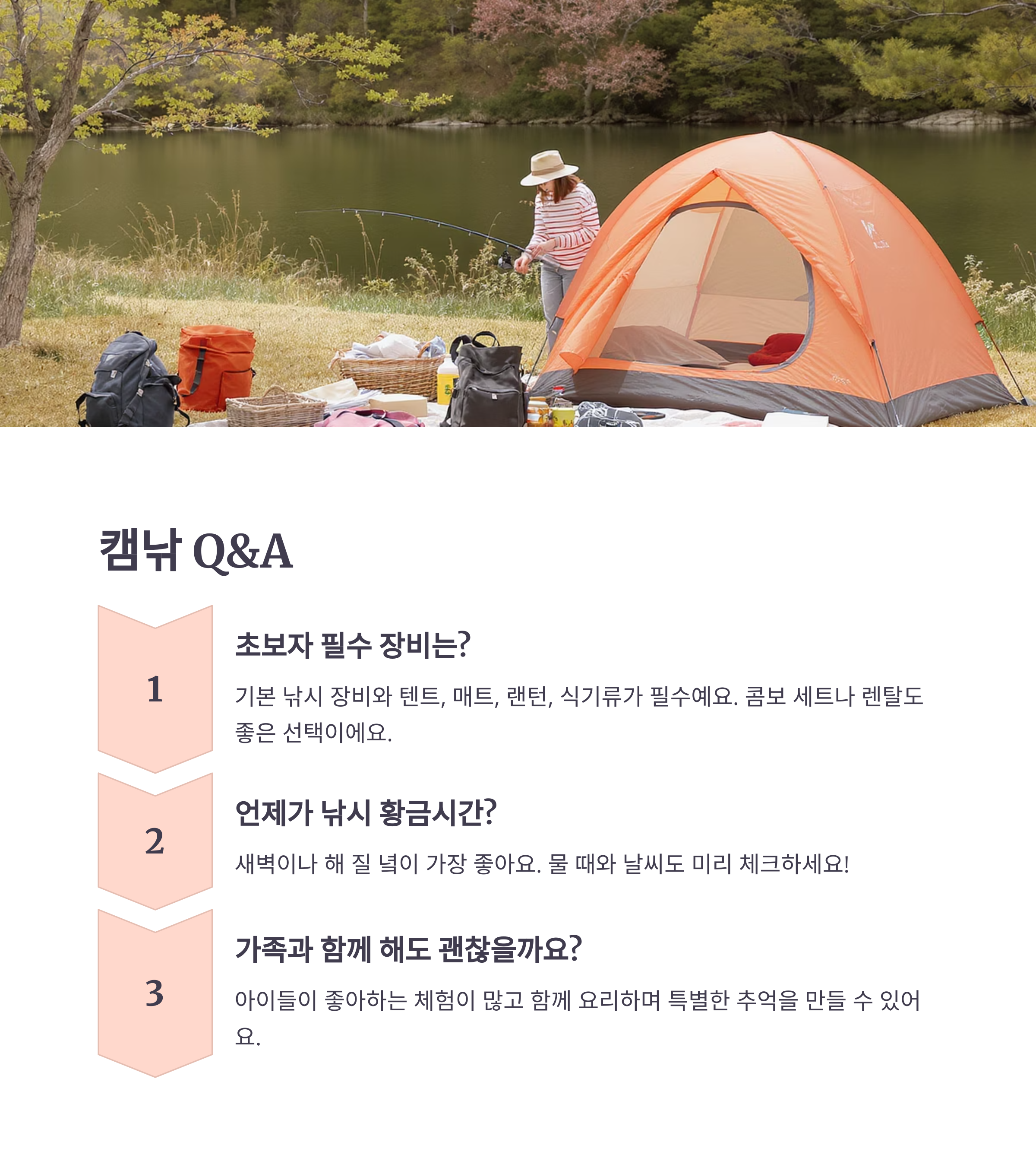 A1) 낚싯대, 미끼, 릴 등 기본 낚시 장비와 텐트, 매트, 랜턴, 식기류가 꼭 필요해요. 초보자는 콤보 세트를 구매하거나 렌탈을 활용해도 좋아요.