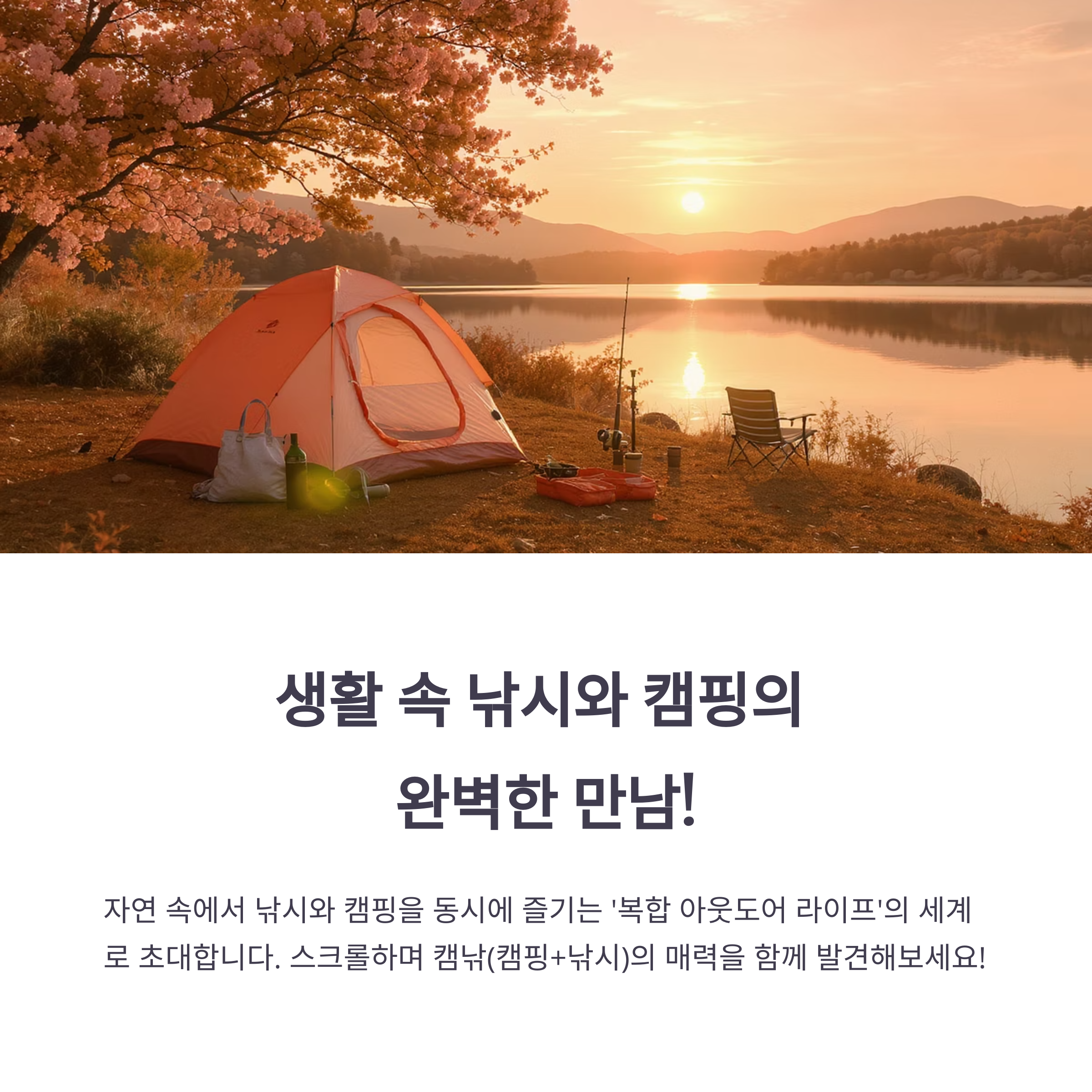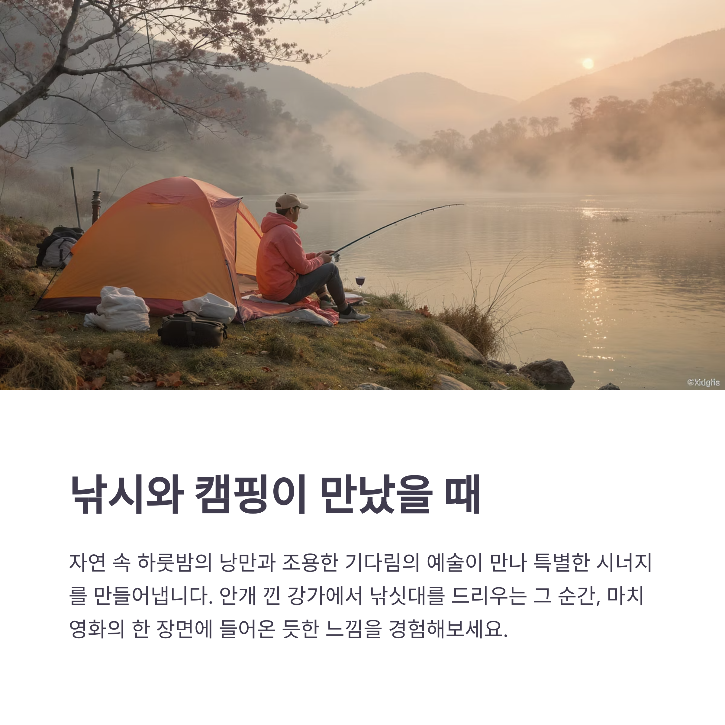 이고, 낚시는 조용한 기다림 속에서 물고기를 낚는 집중의 예술이에요. 이 두 가지가 만났을 때 생기는 시너지는 상상을 초월해요. 낚시터 옆에 텐트를 치고, 해질녘 바람을 맞으며 밥을 짓는 그 느낌… 정말 말로 다 표현할 수 없을 정도예요. 특히 아침 일찍 일어나 안개 낀 강가에서 낚싯대를 드리우는 순간은 영화 속 한 장면 같답니다. 둘 중 하나라도 좋아하신다면, 이 조합은 분명 빠져들게 될 거예요.