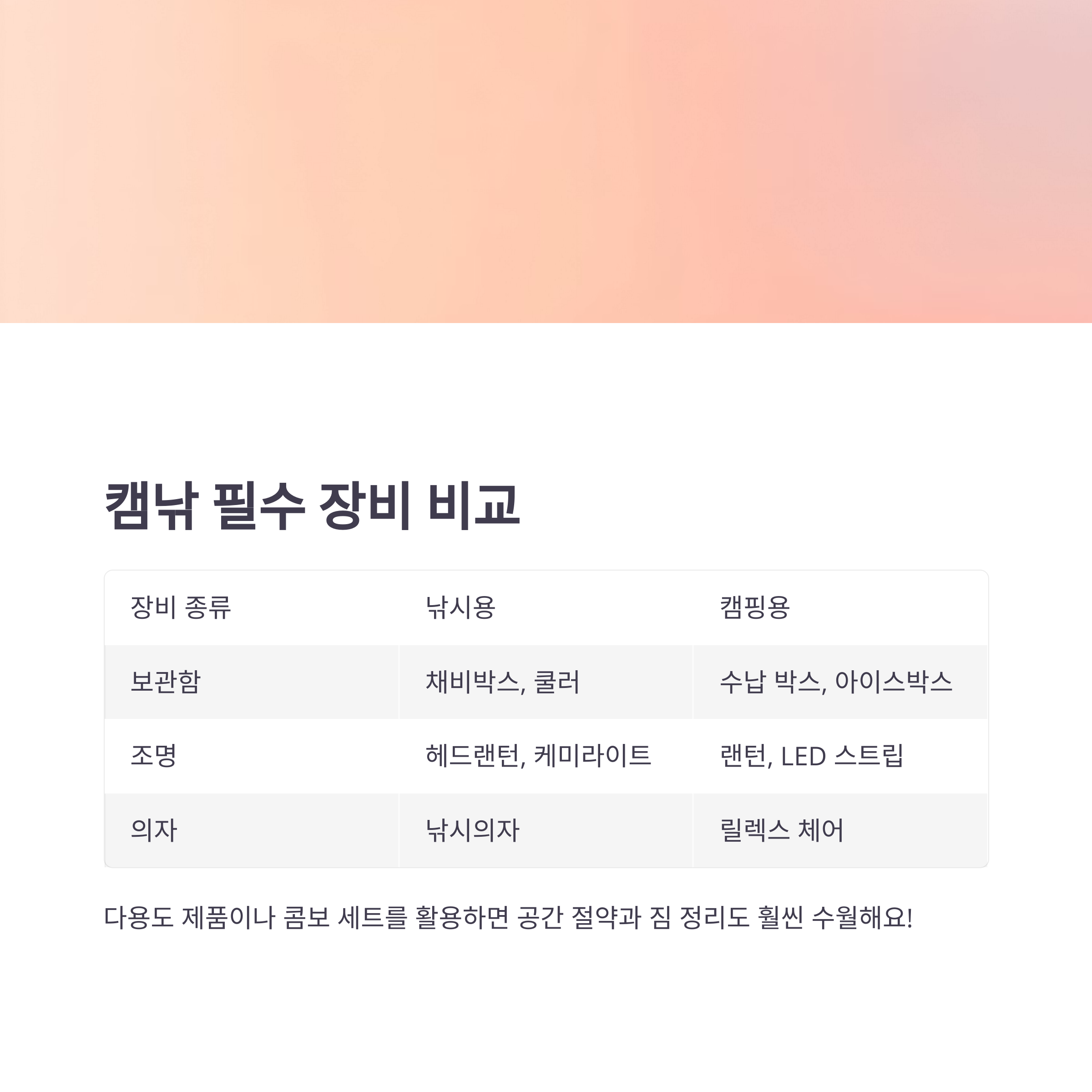 장비를 따로 준비하는 게 부담이라면, 다용도 제품이나 콤보 세트를 활용하는 것도 좋은 방법이에요. 공간 절약은 물론 짐 정리도 훨씬 수월하답니다!