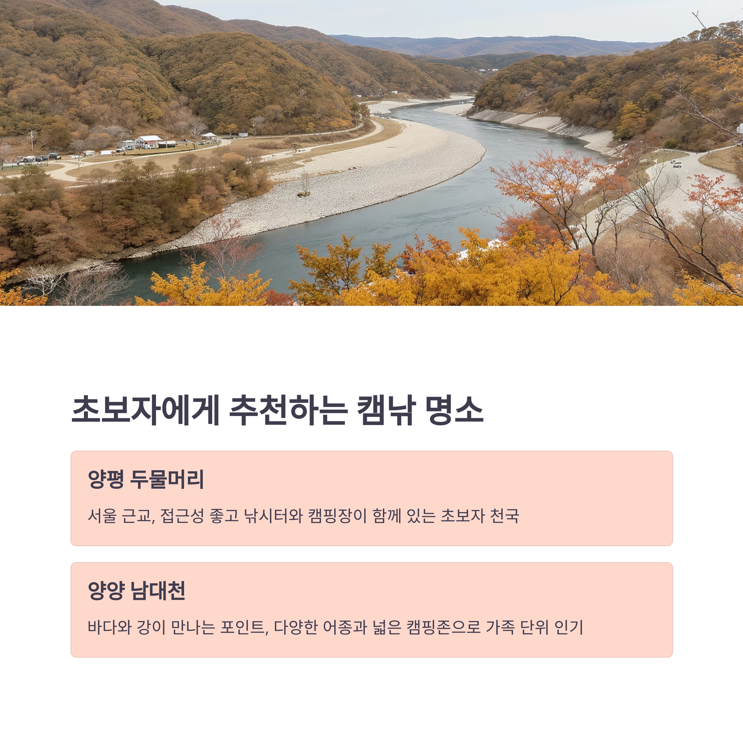 진 곳부터 시작하는 걸 추천드려요. 경기도 양평의 ‘두물머리’는 서울 근교에서 가볍게 다녀오기 좋고, 낚시터와 캠핑장이 함께 있어 초보자에게 이상적이에요. 강원도 양양의 ‘남대천’은 바다와 강이 만나는 포인트라 다양한 어종을 낚을 수 있고, 캠핑존도 넓게 마련돼 있어 가족 단위 캠퍼에게 인기랍니다.