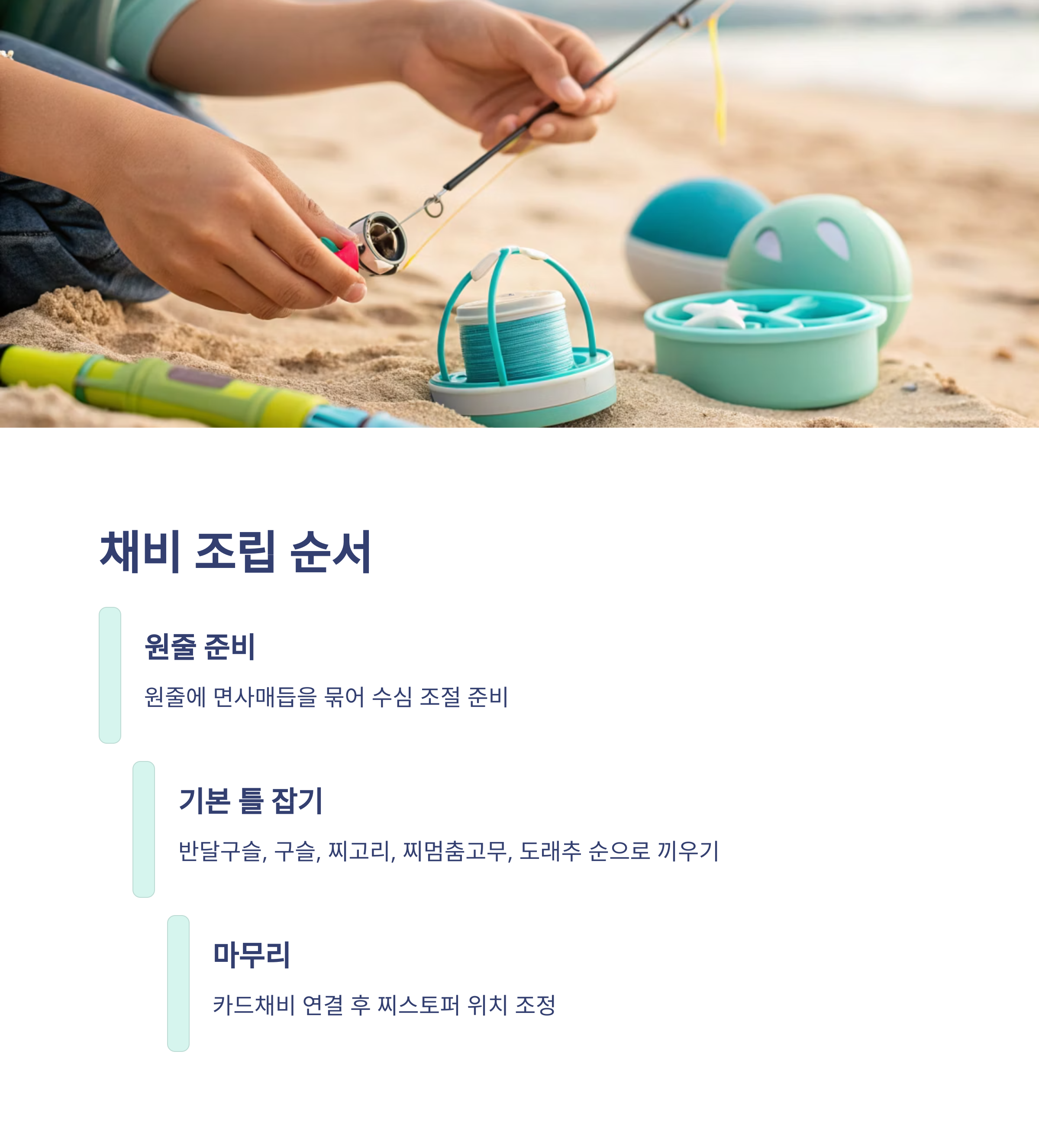 채비는 순서가 정말 중요해요. 먼저 원줄에 면사매듭을 묶어 수심을 조절할 준비를 하세요. 그런 다음 반달구슬, 구슬, 찌고리, 찌멈춤고무, 도래추 순으로 끼워서 기본 틀을 잡아요. 마지막엔 카드채비를 연결하고 찌스토퍼 위치만 잘 맞추면 끝이에요!