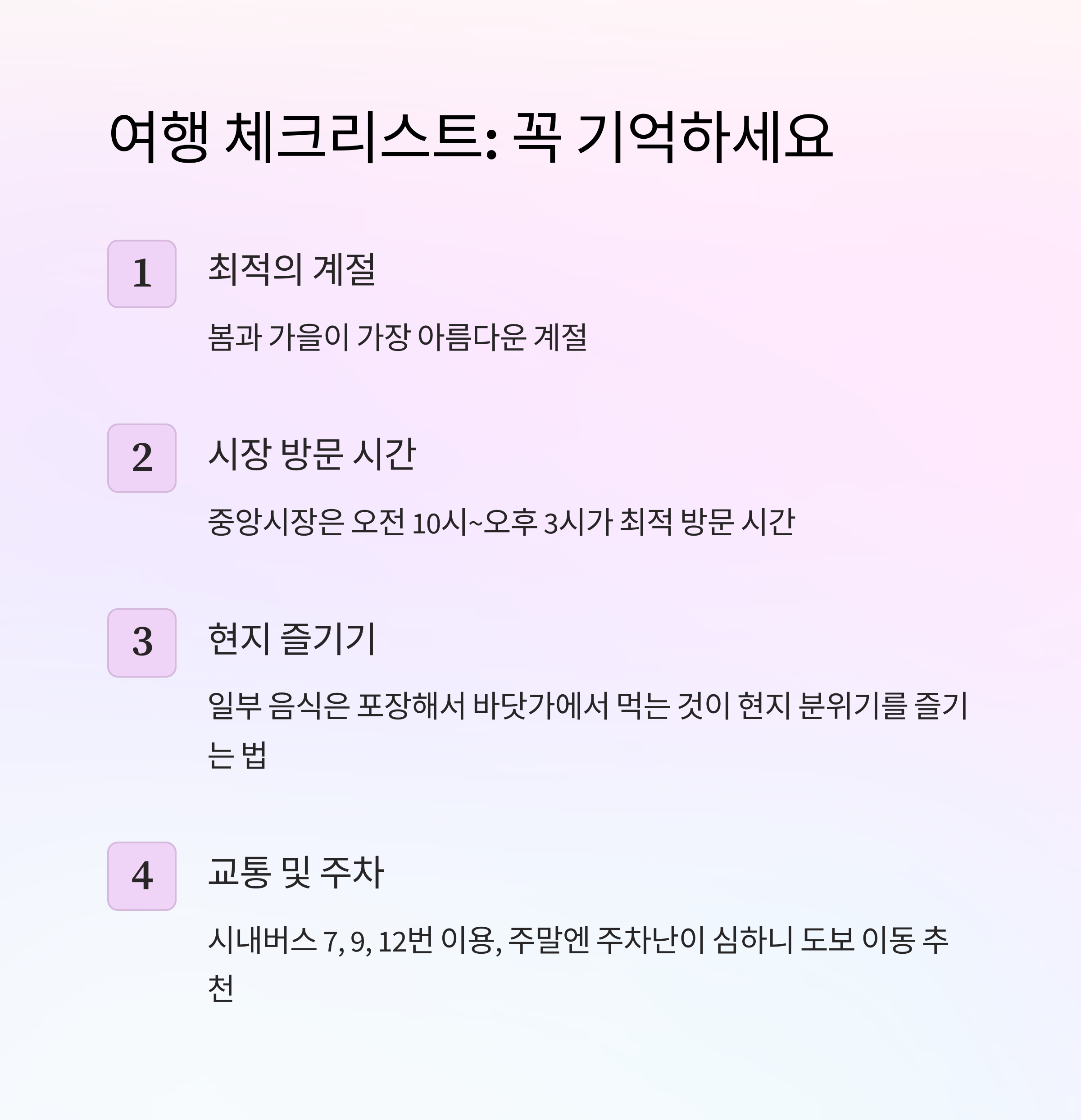 | 중앙시장 → 동명항 | 약 25분 | 포만감 후 가벼운 산책 |