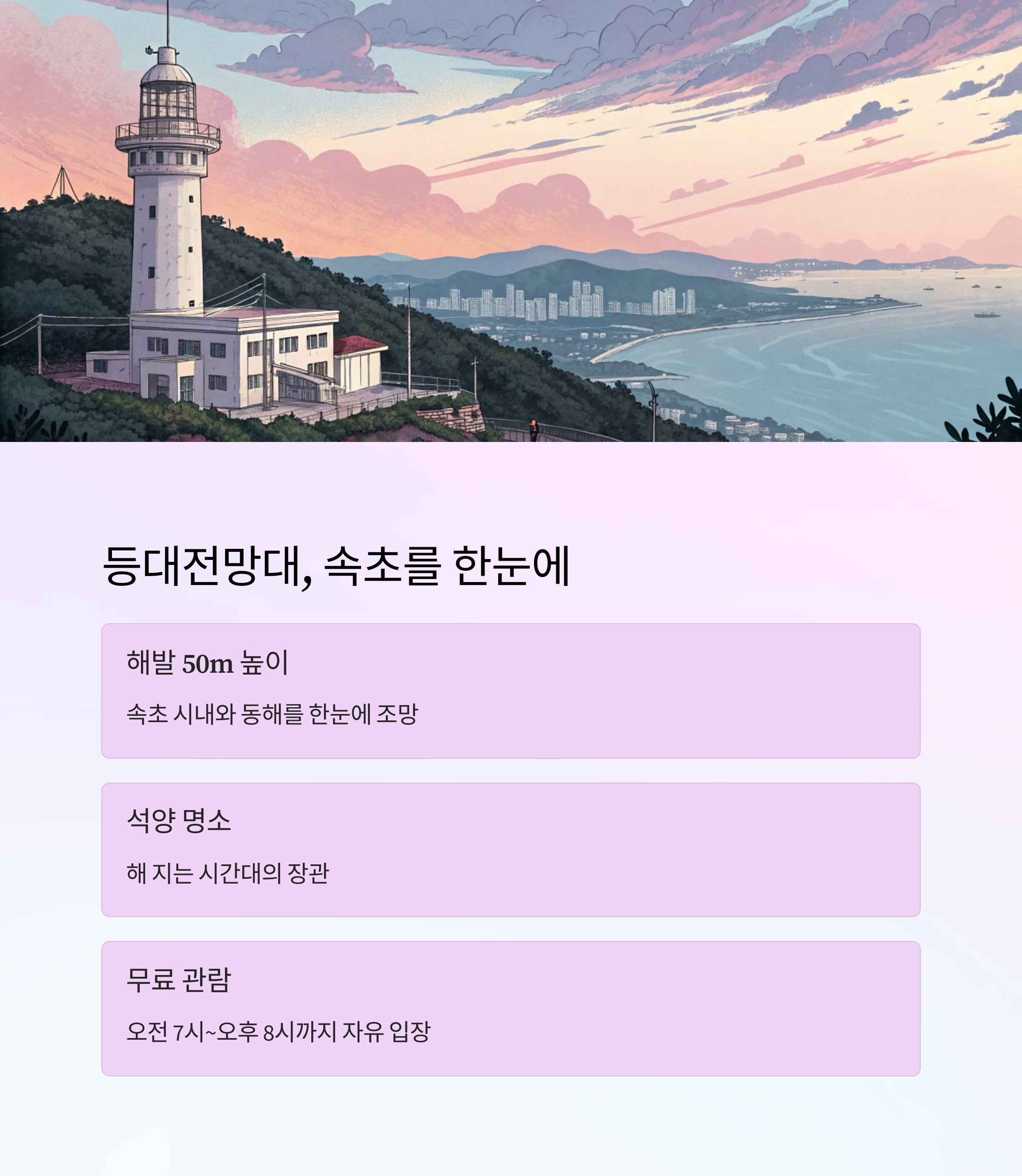 속초는 바다와 도시, 전통과 미식이 완벽히 어우러진 여행지입니다