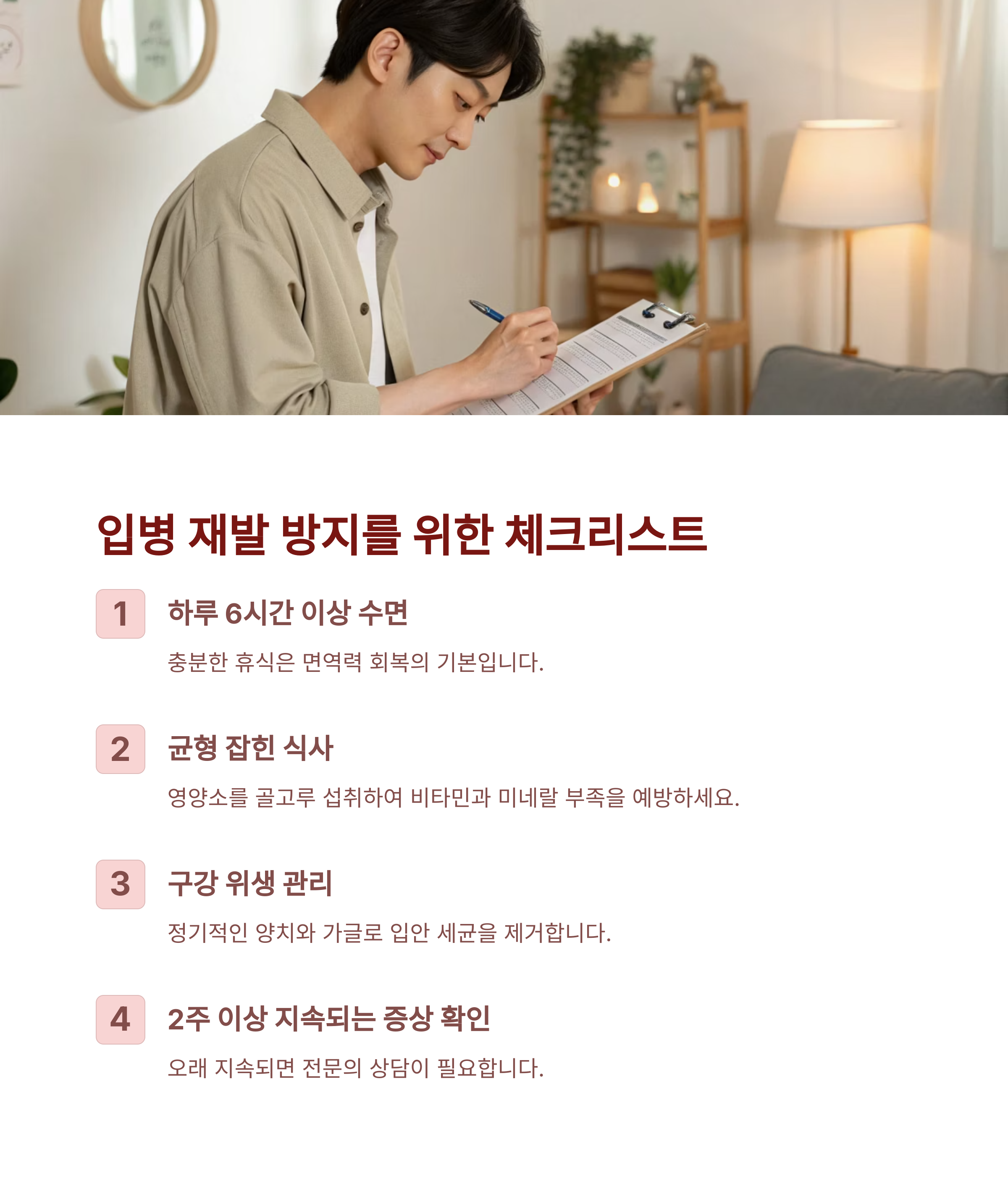 위 질문 중 3개 이상 “아니오”라고 답했다면, 지금이 바로 생활 패턴을 점검할 때입니다. 반복되는 입병을 방치하면 다른 건강 문제로 이어질 수 있으니까요.