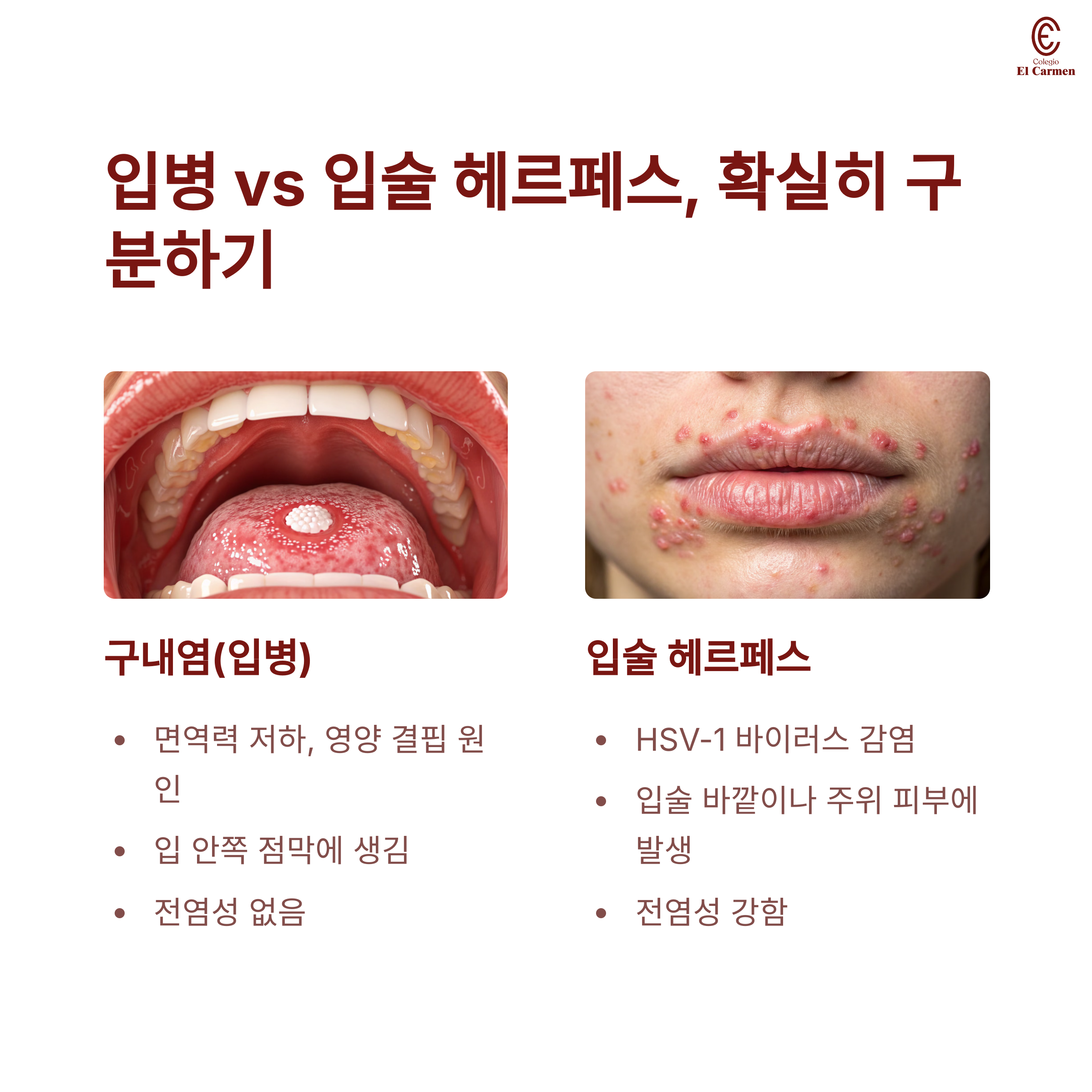입술에 물집이 잡히면 다들 "입병 났다"라고 하죠. 그런데 입병과 입술 헤르페스는 원인부터 다르답니다! 아래 비교 리스트를 보면 두 질환의 차이가 확실히 보일 거예요.