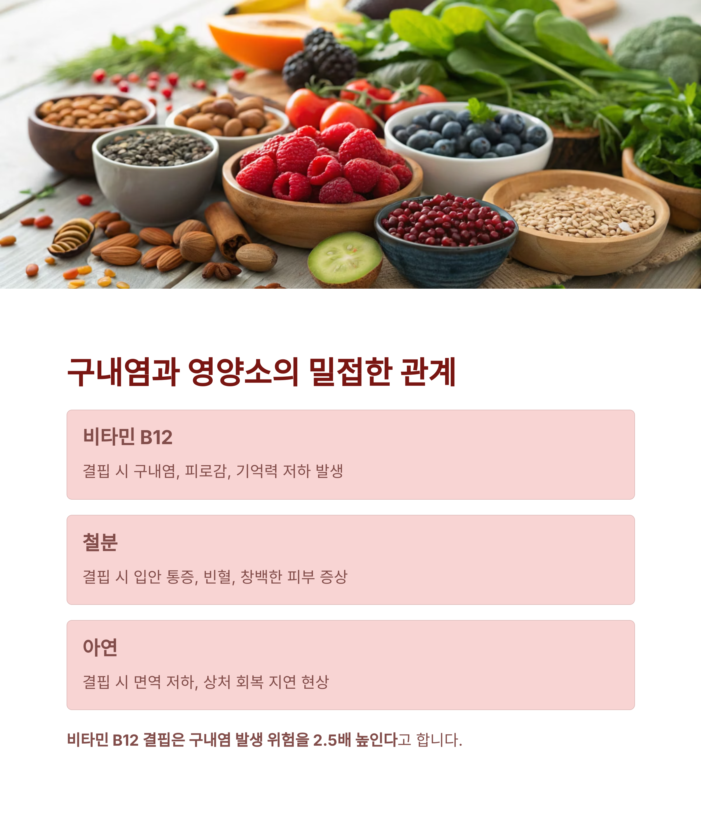 위 인용처럼, 특정 영양소 부족은 입안 건강에 직접적인 영향을 줍니다. 특히 비타민 B군은 점막 세포의 성장과 회복에 관여하기 때문에 부족하면 구내염이 잘 생기죠. 철분과 아연도 마찬가지예요. 철분은 혈액 산소 운반에, 아연은 면역 반응에 관여하니까요.