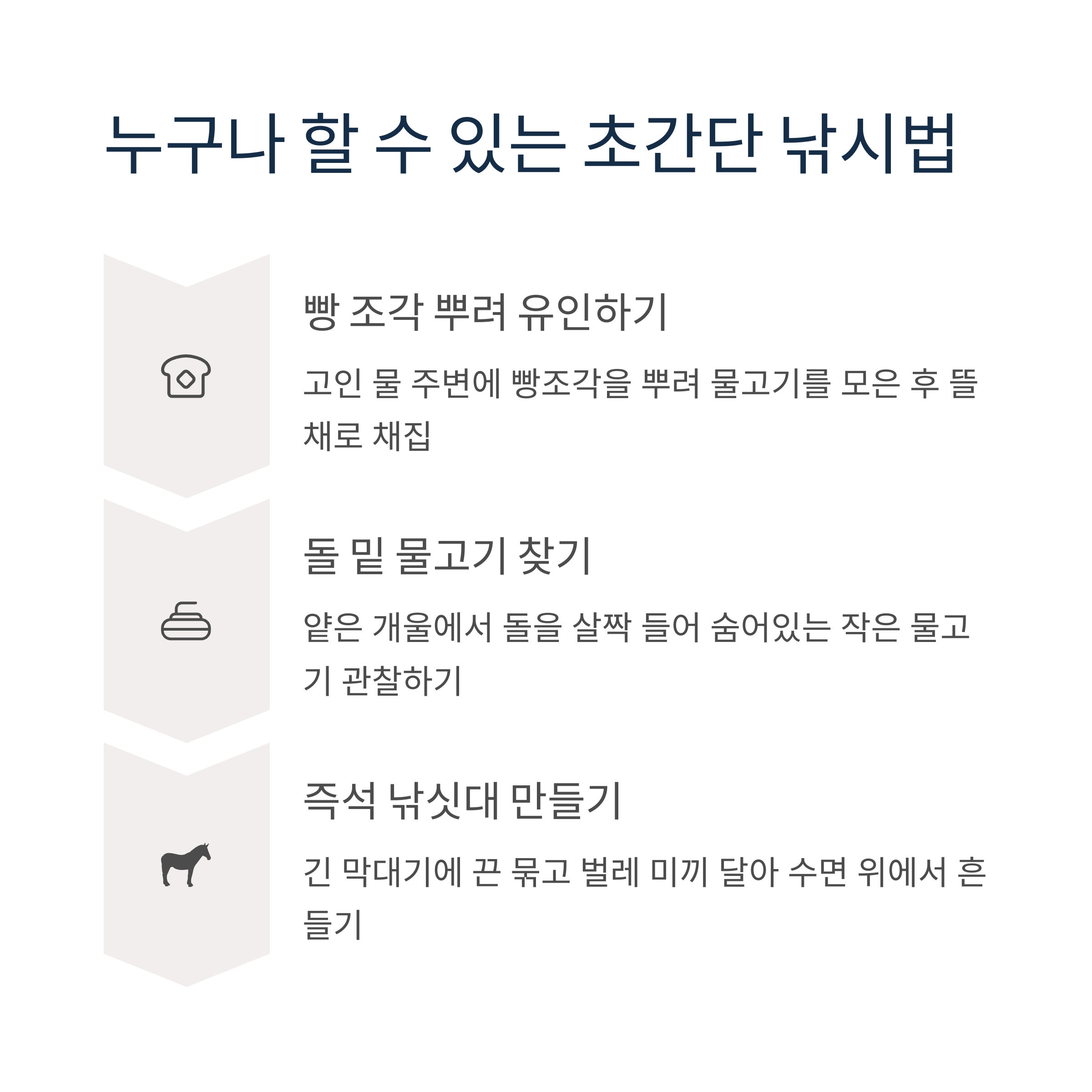 장비가 없어도 시도해 볼 수 있는 생활 낚시법이 의외로 많습니다. 물고기와의 두뇌 싸움이라기보단, 자연과의 타협이라고 볼 수 있을지도요. 다음은 누구나 해볼 수 있는 간단한 낚시 방식이에요.