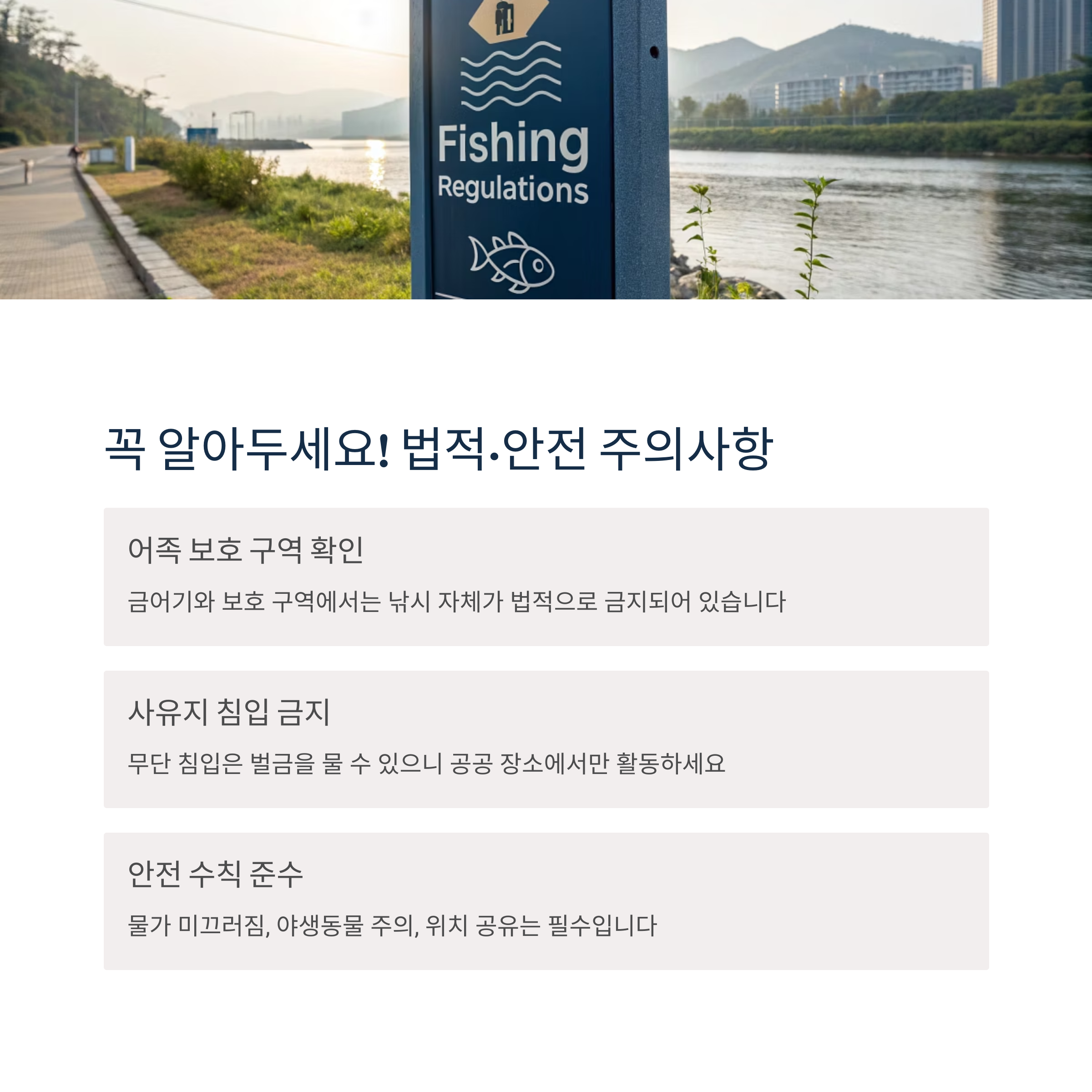 아무리 간단한 생활 낚시라도, 법과 안전은 기본 중의 기본이에요. 먼저 ‘어족 보호 구역’이나 ‘금어기’에 해당하는 장소에서는 낚시 자체가 금지되어 있습니다.