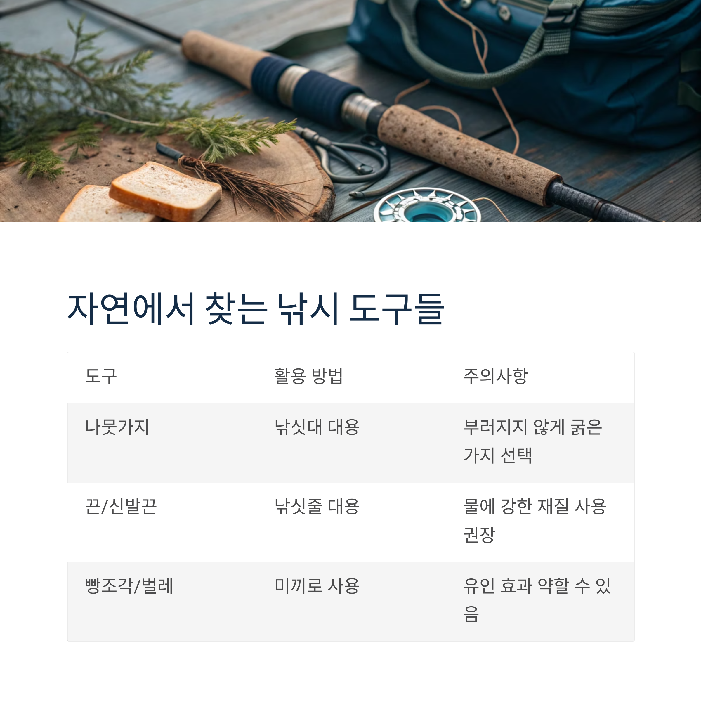 | 나뭇가지 | 낚싯대 대용으로 활용 | 부러지지 않게 굵은 가지 선택 |