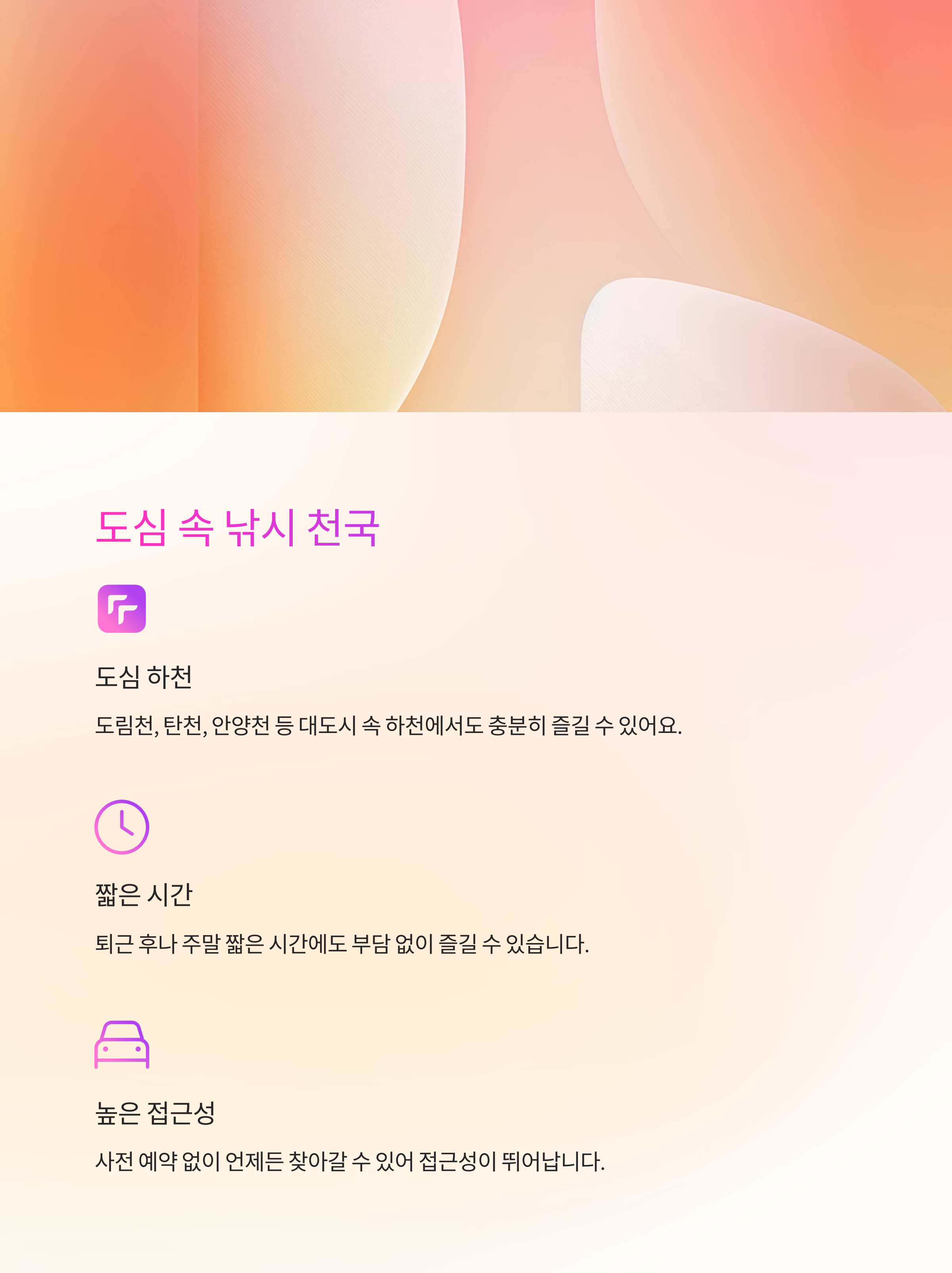 도심의 스트레스를 내려놓고 물가에 앉아 있는 것만으로도 심리적 안정감을 줄 수 있습니다.
