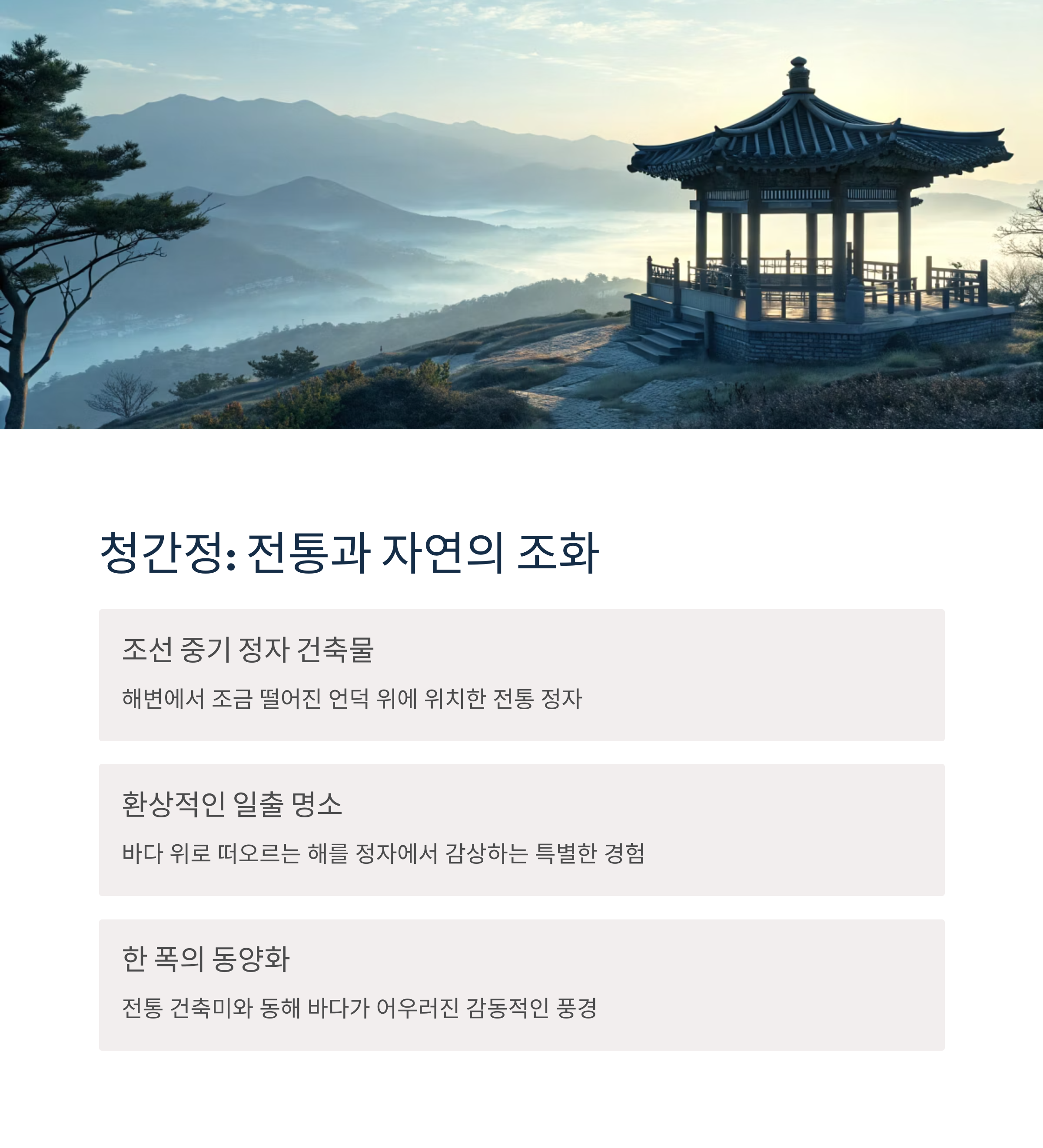 특히 강원도 고성의 청간해수욕장과 청간정은 바다의 푸르름과 조용한 여유를 동시에 느낄 수 있는 보석 같은 장소예요.