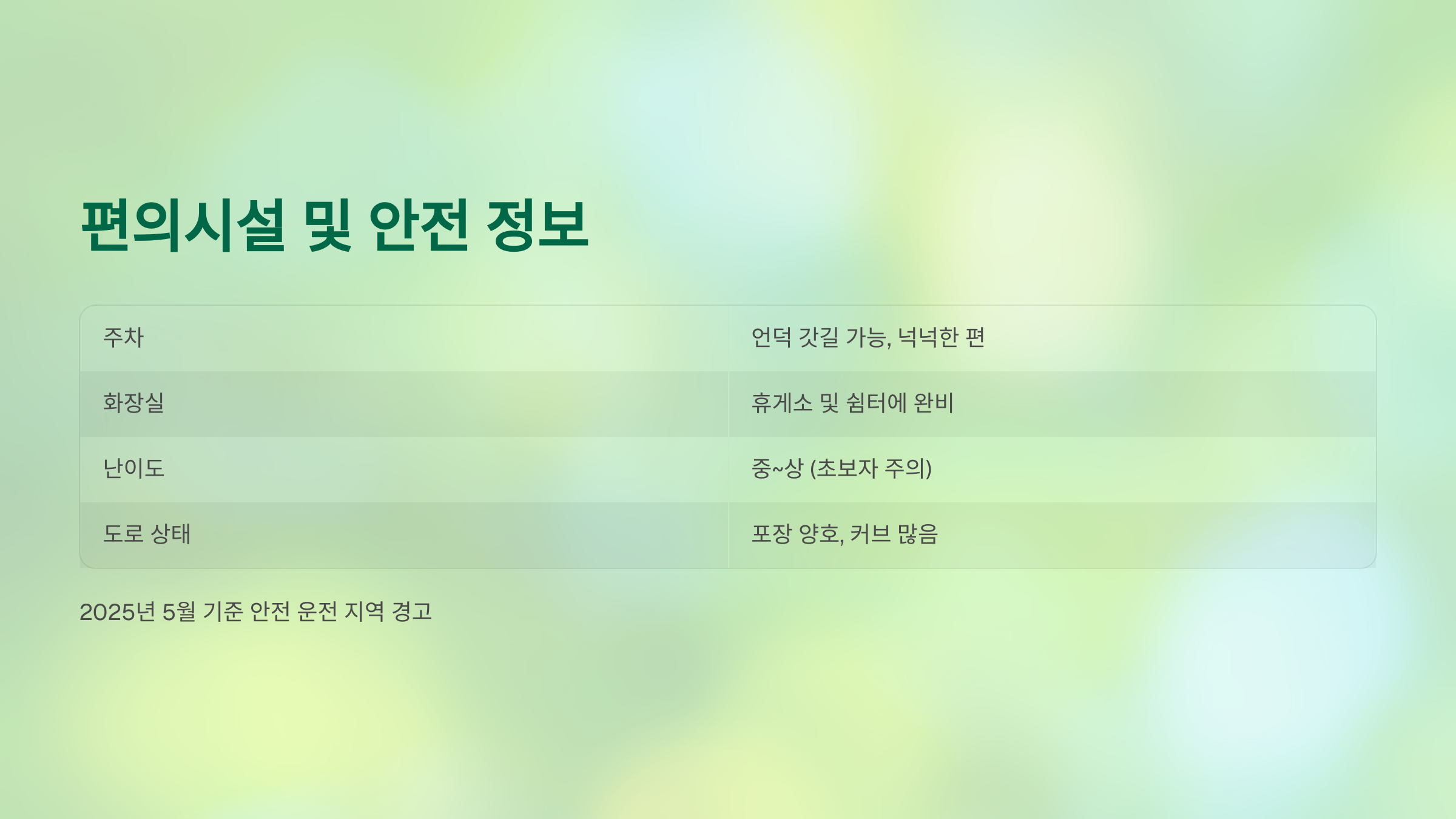 | 도로 상태 | 포장 양호, 커브 많음 |